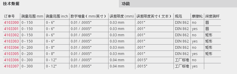 訂單號(hào) | 測(cè)量范圍 mm | 測(cè)量范圍 inch | 數(shù)字增量(mm/英寸) | 誤差限度 (mm) | 誤差限度英寸(文本) | 規(guī)范 | 摩擦輪 | 深度測(cè)桿 |